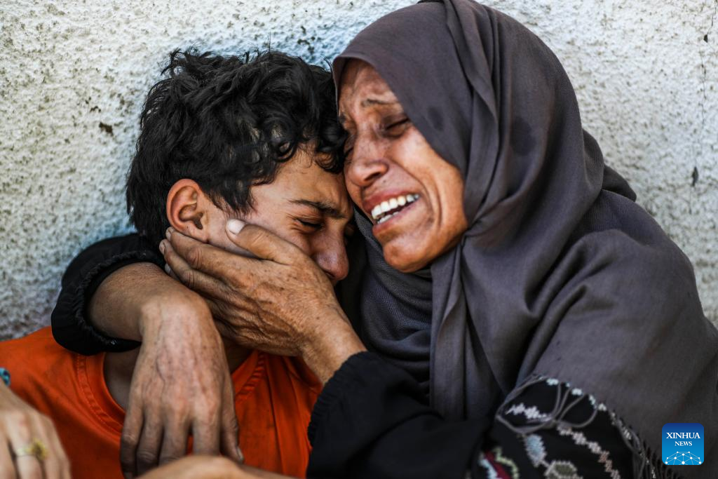 Palestinians mourn for victims at Al-Shifa Hospital in central Gaza City, on Aug. 6, 2025. At least 27 Palestinians were killed in Israeli attacks on Wednesday, while 20 others died in a food truck overturn in the Gaza Strip, according to Palestinian sources. (Photo by Mahmoud Zaki/Xinhua)