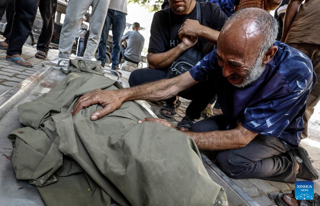 Palestinians mourn for a victim at Al-Shifa Hospital in central Gaza City, on Aug. 6, 2025. At least 27 Palestinians were killed in Israeli attacks on Wednesday, while 20 others died in a food truck overturn in the Gaza Strip, according to Palestinian sources. (Photo by Mahmoud Zaki/Xinhua)
