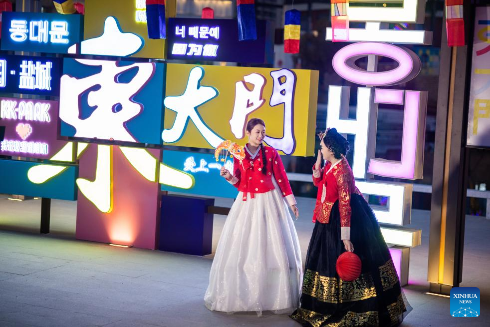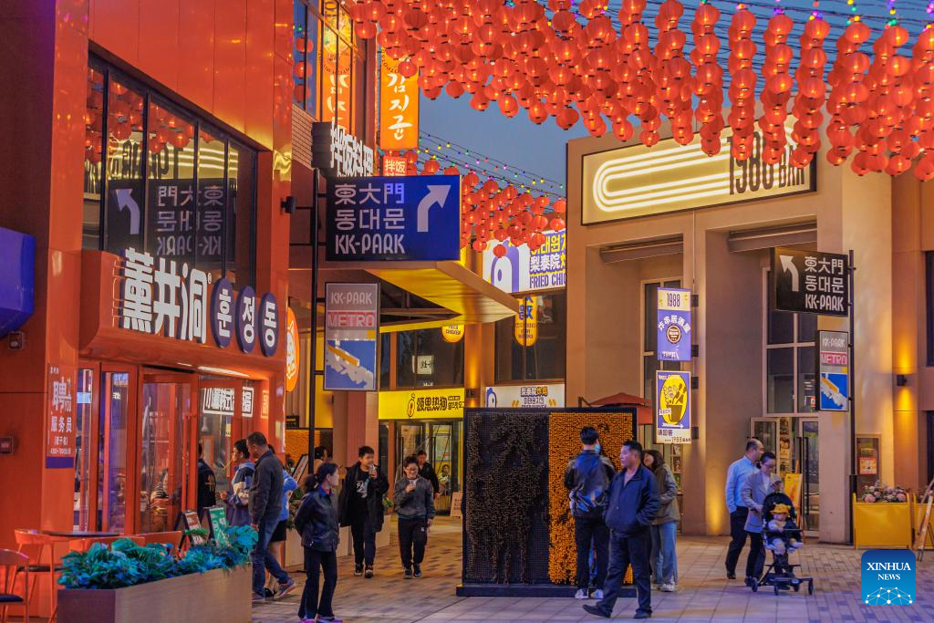 This photo taken on April 17, 2023 shows a view of a Korean-style food street at China-ROK International Street, also known as Dongdaemun KK-PARK, in the Yancheng Economic and Technological Development Zone of Yancheng City, east China's Jiangsu Province. (Dongdaemun KK-PARK/Handout via Xinhua)