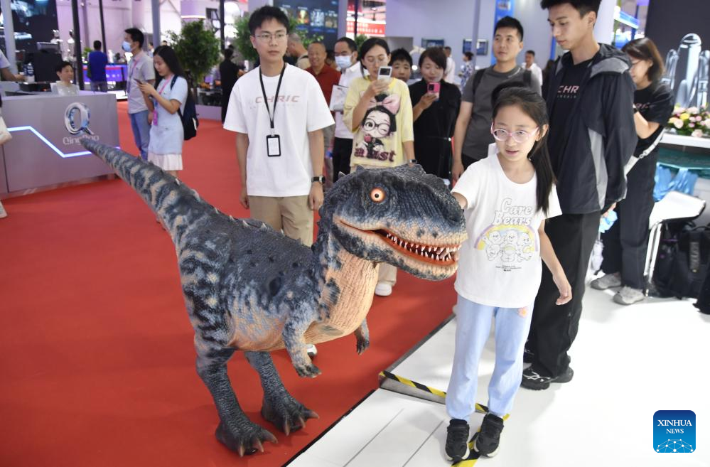 A girl interacts with an animatronic dinosaur during the 2025 World Robot Conference (WRC) in Beijing, capital of China, Aug. 8, 2025. The 2025 WRC that kicked off on Friday in Beijing unveiled future development trends of embodied intelligent robots, focusing on fields such as cognition, decision-making and safety.