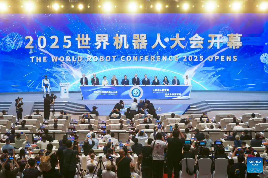 Guests inaugurate the 2025 World Robot Conference (WRC) in Beijing, capital of China, Aug. 8, 2025. The 2025 WRC that kicked off on Friday in Beijing unveiled future development trends of embodied intelligent robots, focusing on fields such as cognition, decision-making and safety. Co-hosted by the Chinese Institute of Electronics and the World Robot Cooperation Organization, the five-day event features forums, exhibitions, competitions and networking events, with over 200 robotics companies from around the world presenting their latest innovations. (Xinhua/Xie Han)