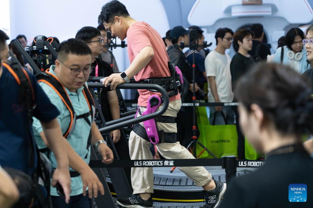 An exoskeleton robot is displayed at the 2025 World Robot Conference (WRC) in Beijing, capital of China, Aug. 8, 2025. The 2025 WRC that kicked off on Friday in Beijing unveiled future development trends of embodied intelligent robots, focusing on fields such as cognition, decision-making and safety.