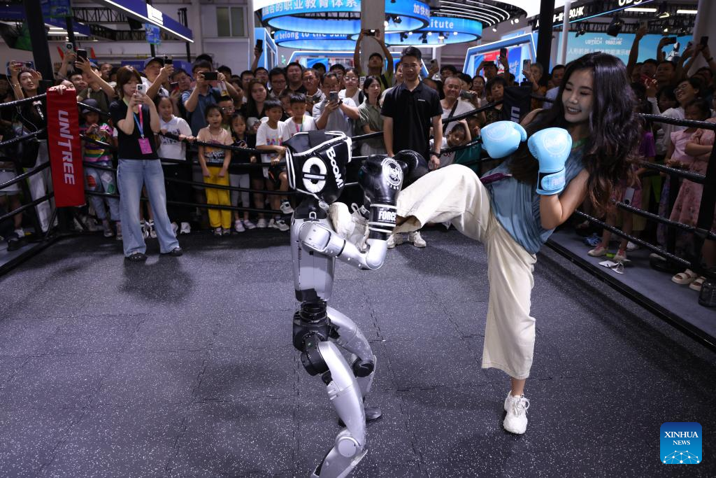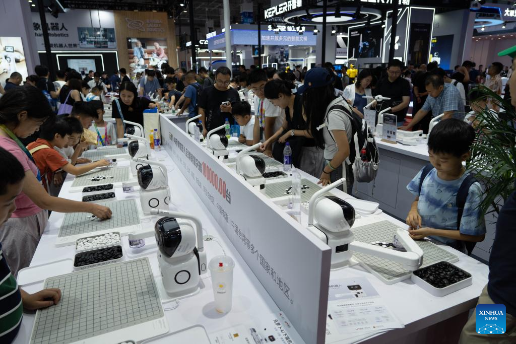Visitors play against robots at the 2025 World Robot Conference (WRC) in Beijing, capital of China, Aug. 8, 2025. The 2025 WRC that kicked off on Friday in Beijing unveiled future development trends of embodied intelligent robots, focusing on fields such as cognition, decision-making and safety.