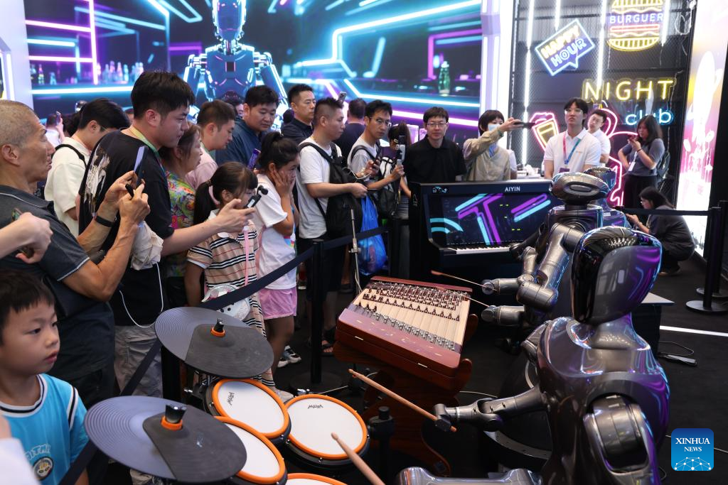 Visitors watch a performance by a robot band at the 2025 World Robot Conference (WRC) in Beijing, capital of China, Aug. 8, 2025. The 2025 WRC that kicked off on Friday in Beijing unveiled future development trends of embodied intelligent robots, focusing on fields such as cognition, decision-making and safety.