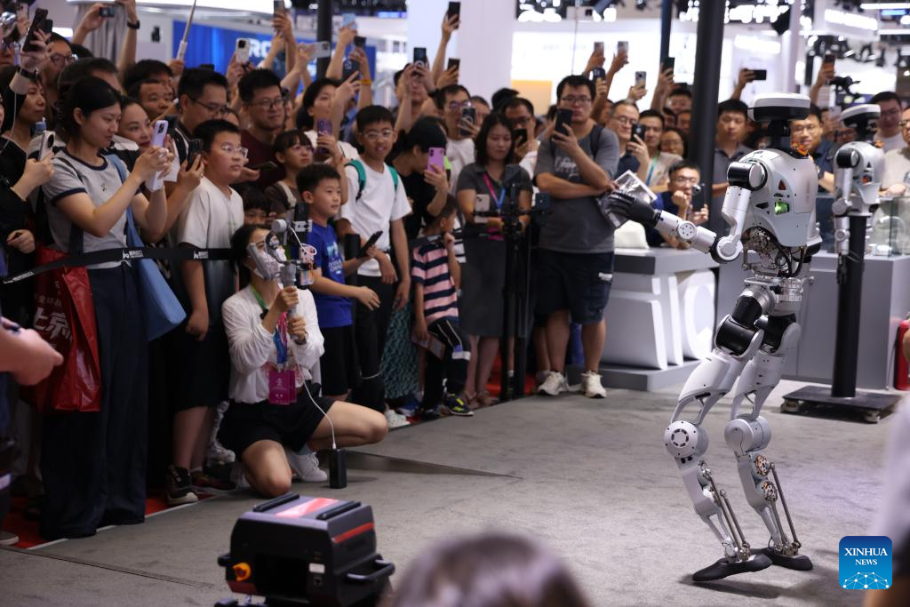 Visitors watch the performance of a humanoid robot during the 2025 World Robot Conference (WRC) in Beijing, capital of China, Aug. 8, 2025. The 2025 WRC that kicked off on Friday in Beijing unveiled future development trends of embodied intelligent robots, focusing on fields such as cognition, decision-making and safety.