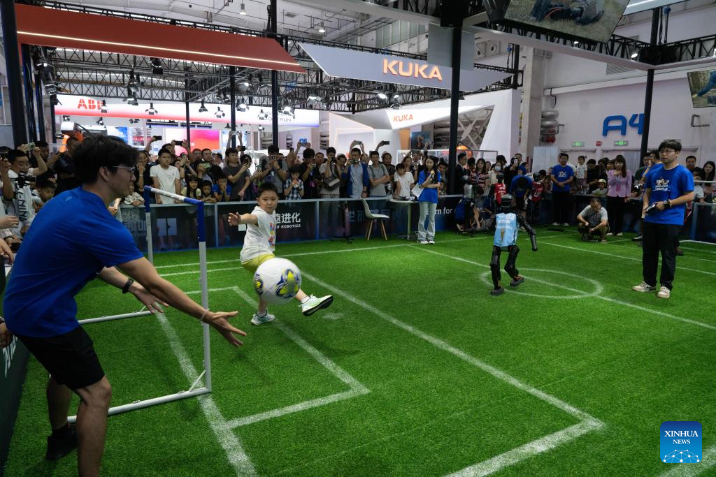 Visitors play football with robots at the 2025 World Robot Conference (WRC) in Beijing, capital of China, Aug. 8, 2025. The 2025 WRC that kicked off on Friday in Beijing unveiled future development trends of embodied intelligent robots, focusing on fields such as cognition, decision-making and safety.