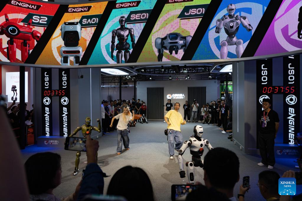 Staff members dance with robots at the 2025 World Robot Conference (WRC) in Beijing, capital of China, Aug. 8, 2025. The 2025 WRC that kicked off on Friday in Beijing unveiled future development trends of embodied intelligent robots, focusing on fields such as cognition, decision-making and safety.