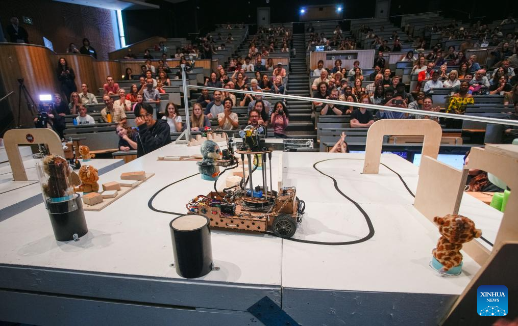 A contestant watches her robot performing tasks during a robotics competition at the University of British Columbia (UBC) in Vancouver, British Columbia, Canada, on Aug. 7, 2025. (Photo by Liang Sen/Xinhua)