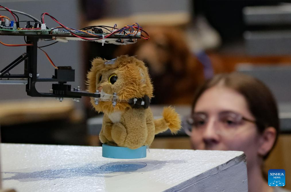 Contestants tune up their robot during a robotics competition at the University of British Columbia (UBC) in Vancouver, British Columbia, Canada, on Aug. 7, 2025. (Photo by Liang Sen/Xinhua)
