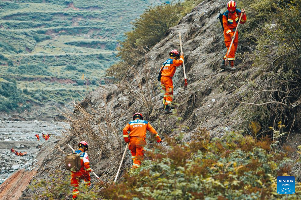 Rescuers search for missing individuals in Jiuzhuanggou Village of Mapo Town in Yuzhong County of northwest China's Gansu Province, Aug. 9, 2025. Rescue efforts are underway after continuous heavy rainfall triggered mountain torrents in Yuzhong County. (Xinhua)