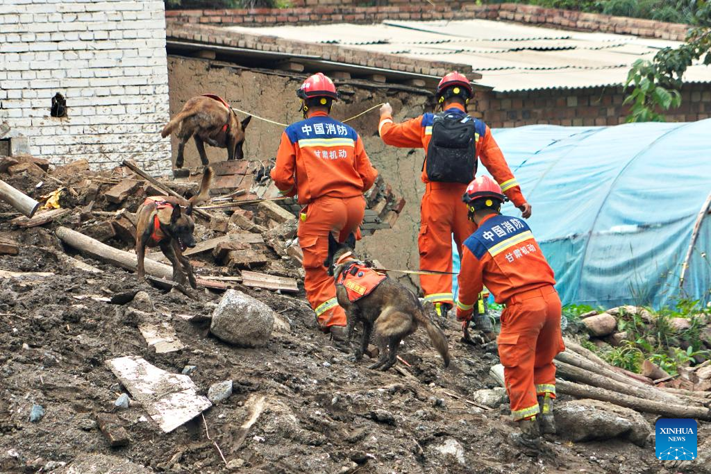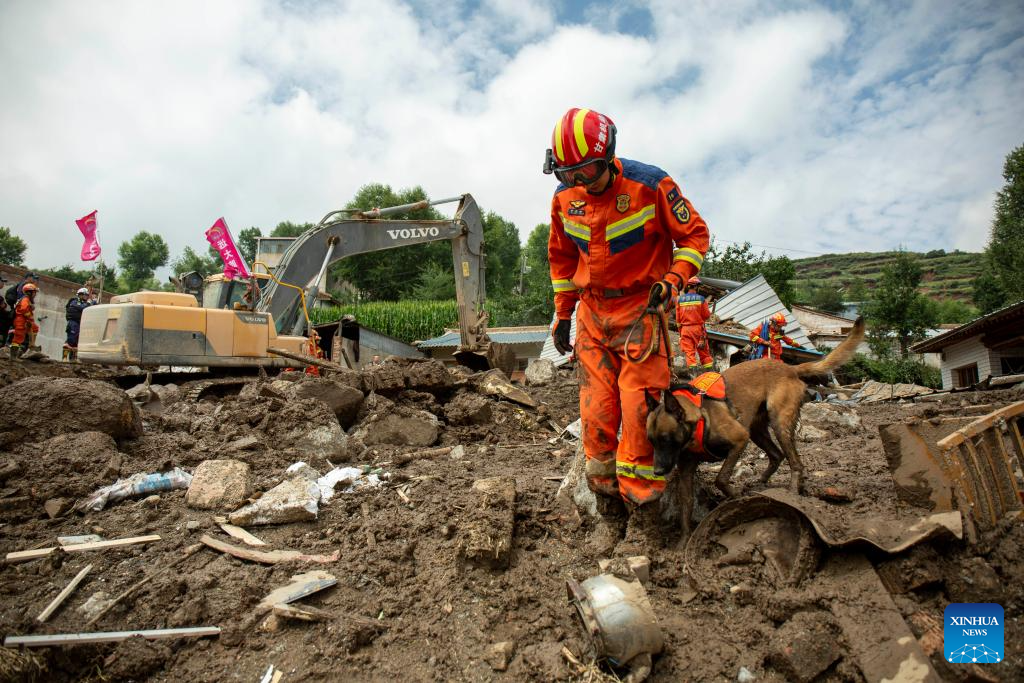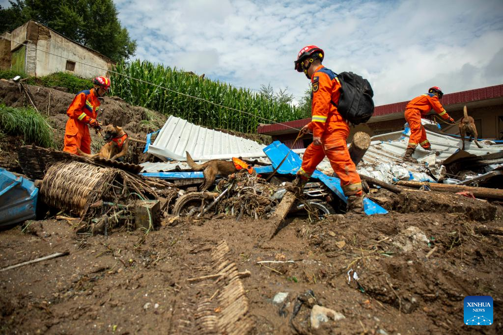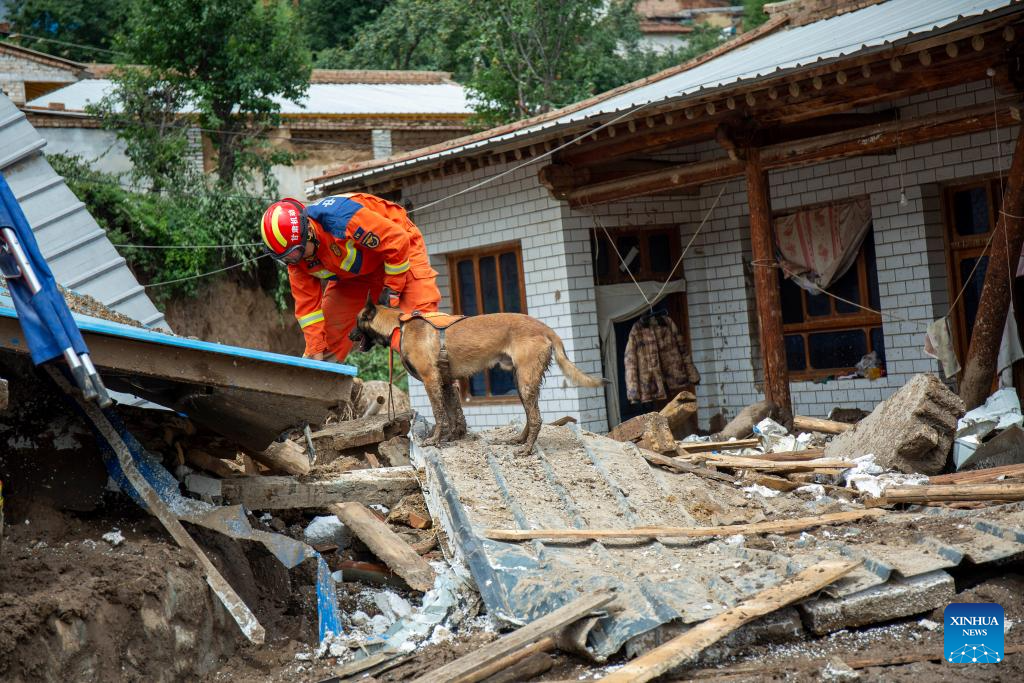 Rescuers search for missing individuals with search and rescue dogs in Jiuzhuanggou Village of Mapo Town in Yuzhong County of northwest China's Gansu Province, Aug. 9, 2025. Rescue efforts are underway after continuous heavy rainfall triggered mountain torrents in Yuzhong County. (Xinhua)