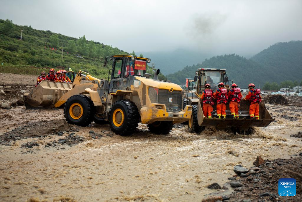 Rescuers search for missing individuals in Yuzhong County of northwest China's Gansu Province, Aug. 9, 2025. Rescue efforts are underway after continuous heavy rainfall triggered mountain torrents in Yuzhong County. (Xinhua)