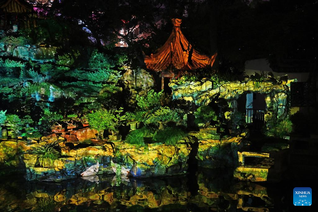 Tourists visit a scenic spot illuminated with artistic lights in Yuyuan Garden, Shanghai, east China, on Aug. 8, 2025. Yuyuan Garden, a historic and cultural landmark in Shanghai, began offering night tours on Friday. (Xinhua/Liu Ying)
