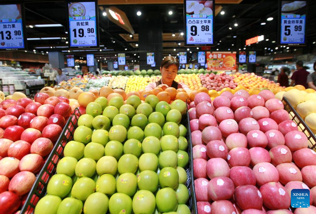 A woman buys fruits at a supermarket in Pingyi County of Linyi City, east China's Shandong Province, Aug. 9, 2025. China's consumer price index (CPI), a main gauge of inflation, climbed 0.4 percent in July compared with the previous month, reversing a 0.1-percent drop in June and exceeding the average seasonal pace of 0.3 percent, data from the National Bureau of Statistics (NBS) showed Saturday. (Photo by Wu Jiquan/Xinhua)