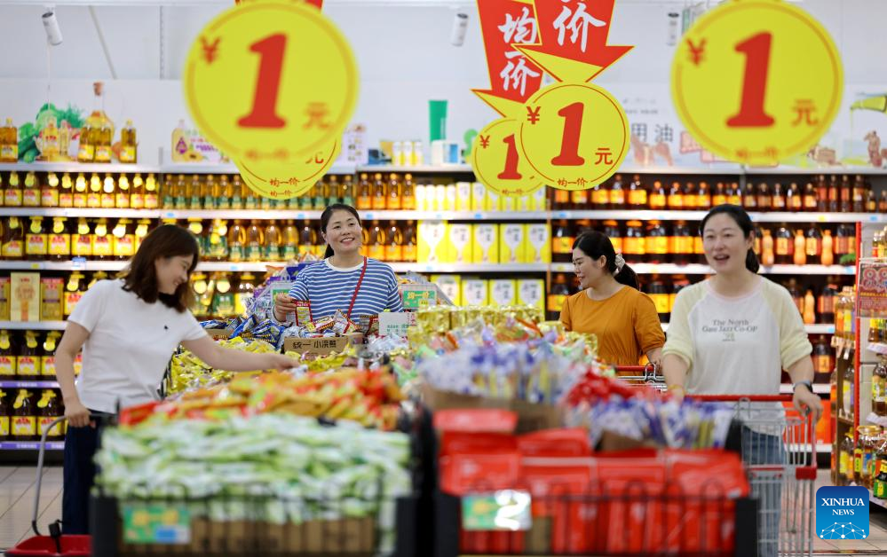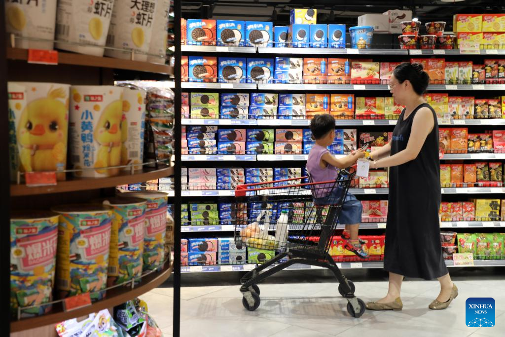 People shop at a supermarket in Boxing County of Binzhou City, east China's Shandong Province, Aug. 9, 2025. China's consumer price index (CPI), a main gauge of inflation, climbed 0.4 percent in July compared with the previous month, reversing a 0.1-percent drop in June and exceeding the average seasonal pace of 0.3 percent, data from the National Bureau of Statistics (NBS) showed Saturday. (Photo by Chen Bin/Xinhua)