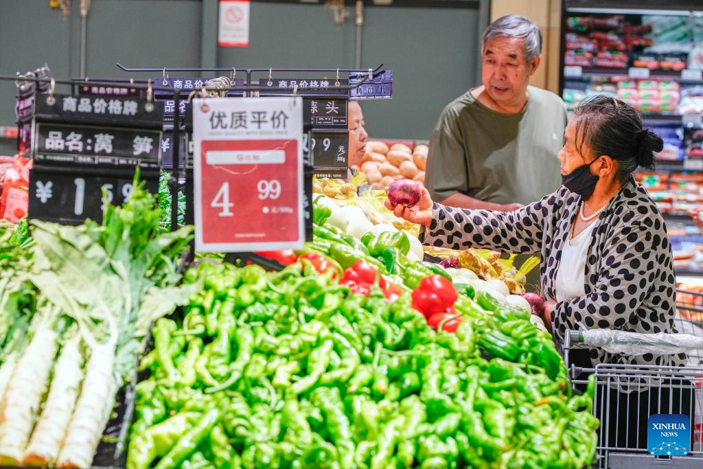 People buy vegetables at a supermarket in Zunhua City, north China's Hebei Province, Aug. 9, 2025. China's consumer price index (CPI), a main gauge of inflation, climbed 0.4 percent in July compared with the previous month, reversing a 0.1-percent drop in June and exceeding the average seasonal pace of 0.3 percent, data from the National Bureau of Statistics (NBS) showed Saturday. (Photo by Liu Mancang/Xinhua)