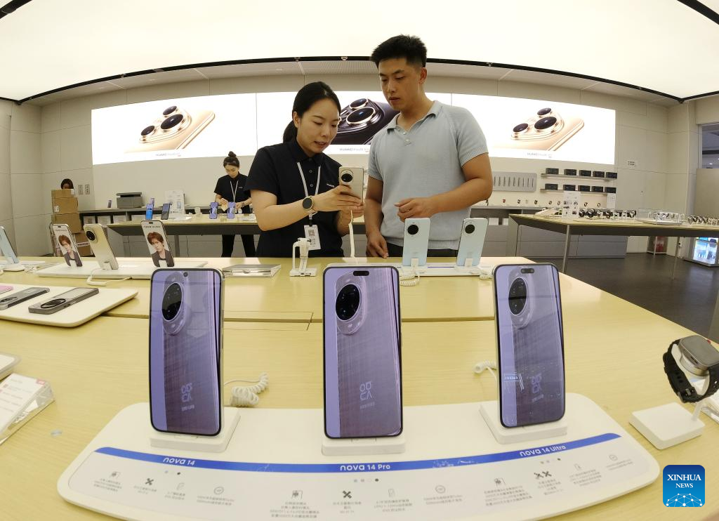 A man selects mobile phone at a shop in Binzhou City, east China's Shandong Province, Aug. 9, 2025. China's consumer price index (CPI), a main gauge of inflation, climbed 0.4 percent in July compared with the previous month, reversing a 0.1-percent drop in June and exceeding the average seasonal pace of 0.3 percent, data from the National Bureau of Statistics (NBS) showed Saturday. (Photo by Chu Baorui/Xinhua)