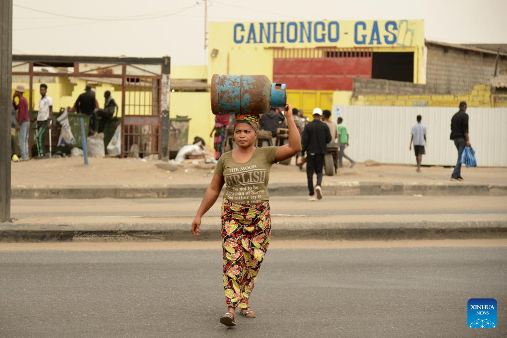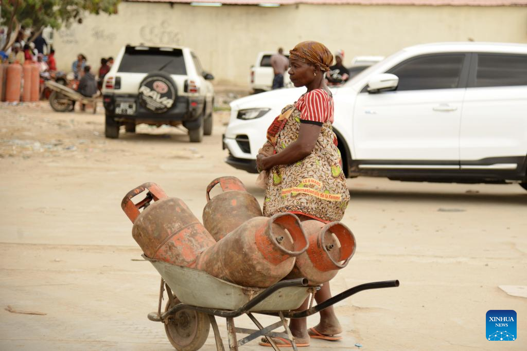 A woman carries a gas cylinder in Luanda, capital of Angola, Aug. 8, 2025. Crowds of people were seen trying to buy bottled cooking gas at resale points in the city, as difficulties in shortages and supply of such products were reported in several areas. (Photo by Julio Kikebu/Xinhua)