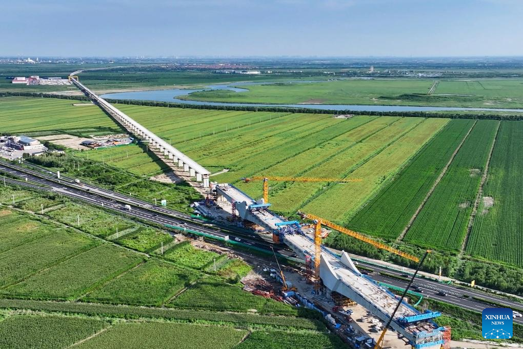 An aerial drone photo taken on Aug. 9, 2025 shows the newly closed continuous beam of Dongshou grand bridge, crossing over Rongcheng-Wuhai expressway, of Tianjin-Weifang high-speed railway, in Shouguang, east China's Shandong Province. Constructed by China Railway 14th Bureau Group Co., Ltd., the continuous beam boasts the longest span among its kind in the Shandong section of Tianjin-Weifang high-speed railway, with a main span of 168 meters. (Photo by Li Chunrui/Xinhua)