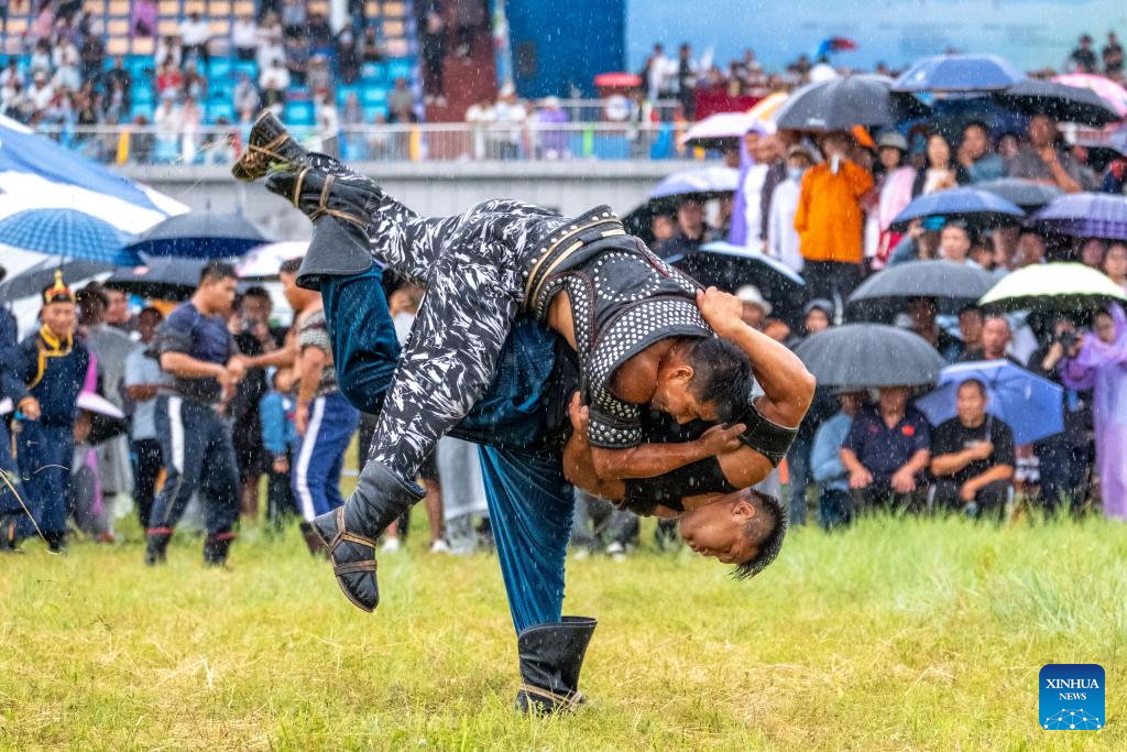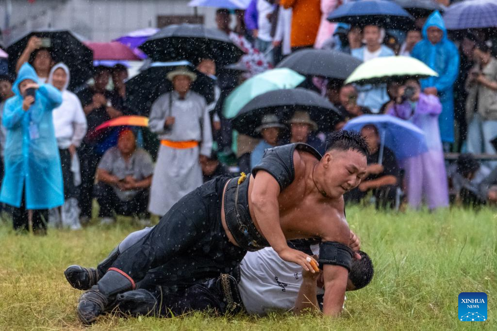 Participants compete during a Mongolian wrestling match at a Nadam fair in Horqin Right Wing Front Banner, Hinggan League, north China's Inner Mongolia Autonomous Region, Aug. 8, 2025. A Nadam fair kicked off here on Friday. (Xinhua/Ma Jinrui)