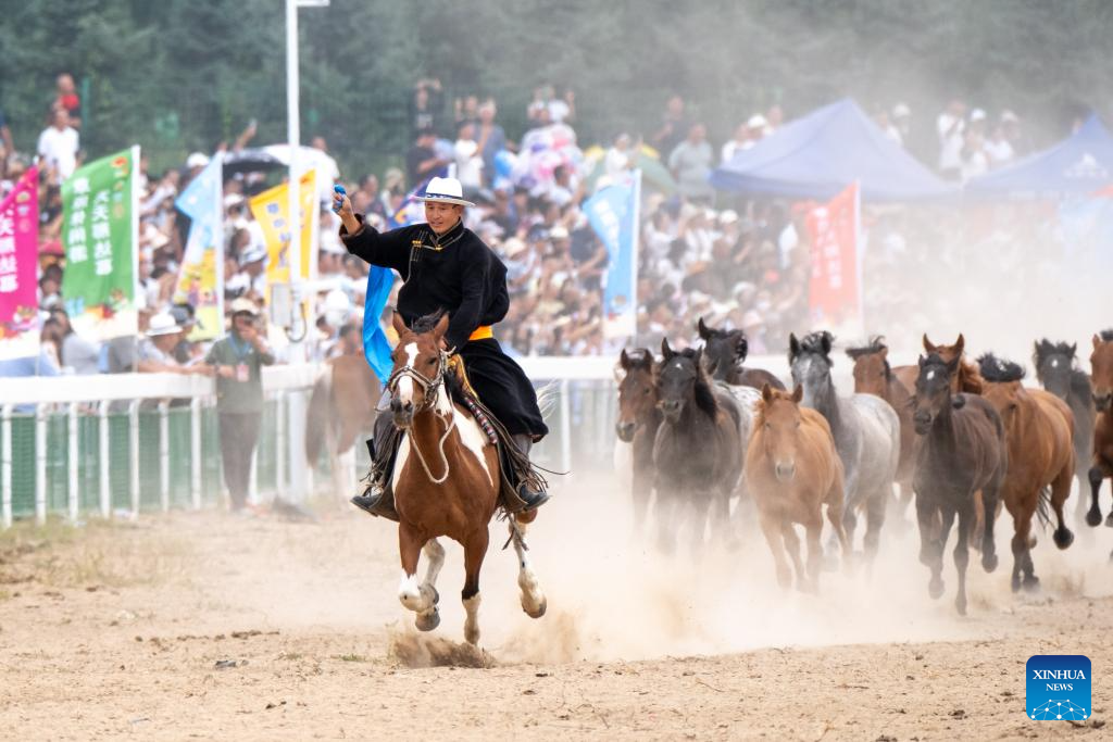 This photo shows a horse racing performance at a Nadam fair in Horqin Right Wing Front Banner, Hinggan League, north China's Inner Mongolia Autonomous Region, Aug. 8, 2025. A Nadam fair kicked off here on Friday. (Xinhua/Ma Jinrui)
