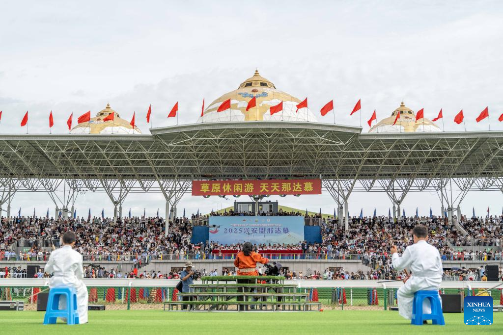 This photo shows the opening ceremony of a Nadam fair in Horqin Right Wing Front Banner, Hinggan League, north China's Inner Mongolia Autonomous Region, Aug. 8, 2025. A Nadam fair kicked off here on Friday. (Xinhua/Ma Jinrui)
