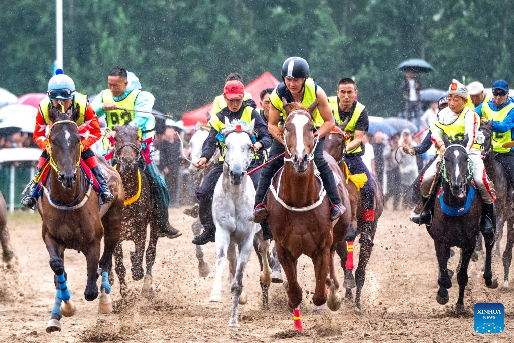 Participants compete during a horse race at a Nadam fair in Horqin Right Wing Front Banner, Hinggan League, north China's Inner Mongolia Autonomous Region, Aug. 8, 2025. A Nadam fair kicked off here on Friday. (Xinhua/Ma Jinrui)