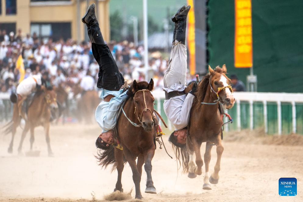 This photo shows a horsemanship performance at a Nadam fair in Horqin Right Wing Front Banner, Hinggan League, north China's Inner Mongolia Autonomous Region, Aug. 8, 2025. A Nadam fair kicked off here on Friday. (Xinhua/Ma Jinrui)