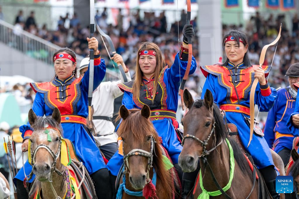 Participants in ethnic attires are pictured at a Nadam fair in Horqin Right Wing Front Banner, Hinggan League, north China's Inner Mongolia Autonomous Region, Aug. 8, 2025. A Nadam fair kicked off here on Friday. (Xinhua/Ma Jinrui)