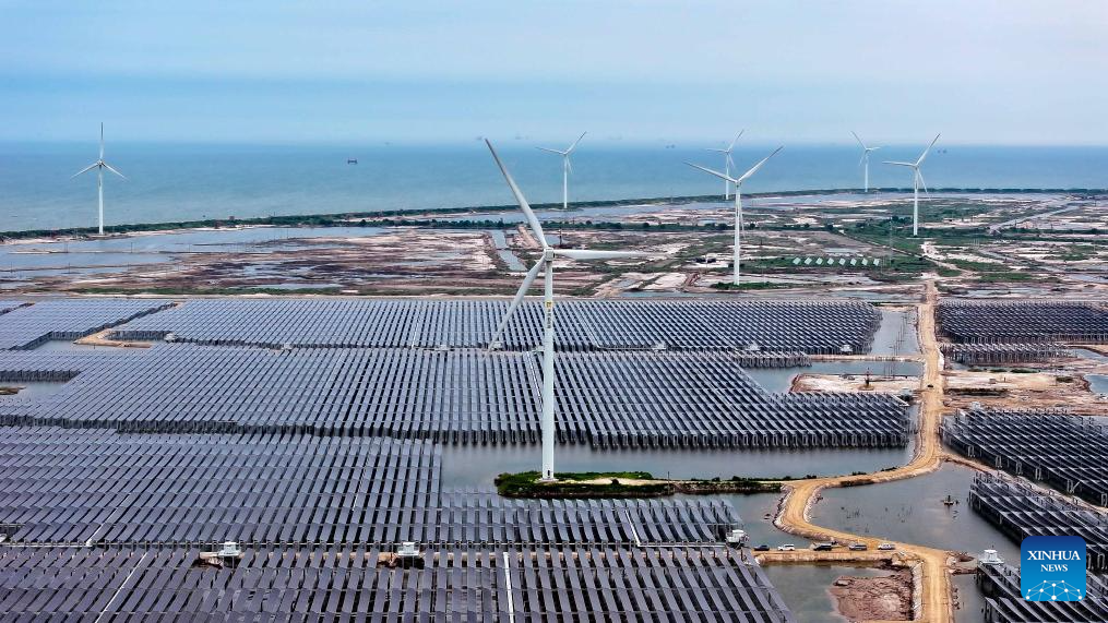 An aerial drone photo taken on Aug. 8, 2025 shows a demonstration project for integrated photovoltaic and energy storage in Dongying City, east China's Shandong Province. Dongying City has been actively developing clean energy in recent years. To make the best of idle land at Shengli Oilfield, a demonstration project for integrated photovoltaic and energy storage with a total installed capacity of 300 megawatts was accomplished in May 2025, seen to annually turn out 480 million kilowatt-hours of electricity. (Xinhua/Guo Xulei)