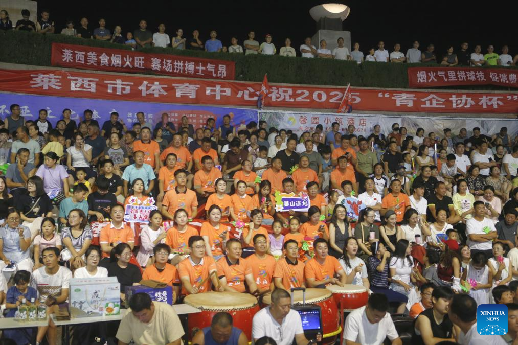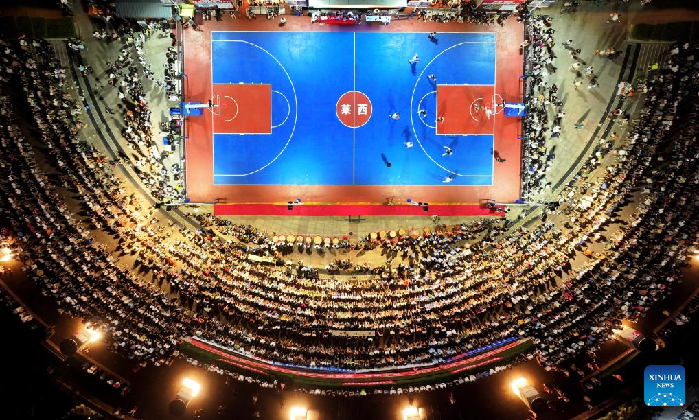 This photo taken on Aug. 8, 2025 shows a scene during a basketball league match in Laixi City, east China's Shandong Province. In recent years, authorities of Laixi City have been hosting themed culture and tourism activities such as city basketball leagues and beer festivals to enrich the nightlife for both residents and tourists. (Xinhua/Ding Hongfa)