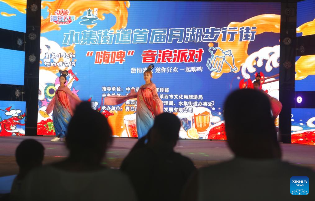Residents watch a performance at a pedestrian street in Laixi City, east China's Shandong Province, Aug. 8, 2025. In recent years, authorities of Laixi City have been hosting themed culture and tourism activities such as city basketball leagues and beer festivals to enrich the nightlife for both residents and tourists. (Xinhua/Ding Hongfa)