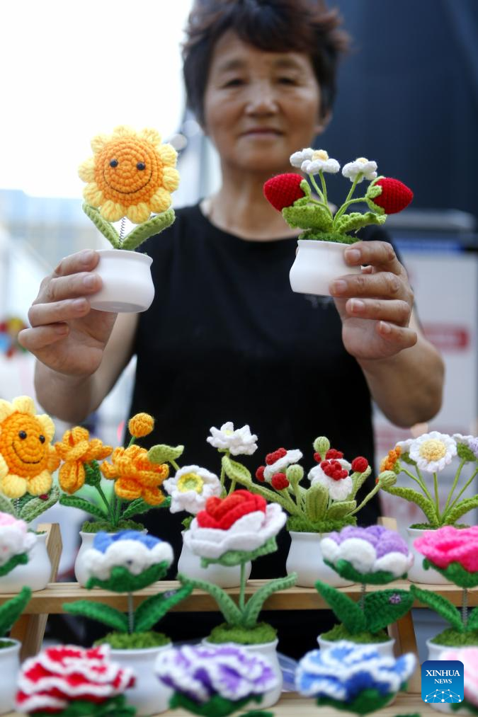 A vendor presents woven handicrafts at a pedestrian street in Laixi City, east China's Shandong Province, Aug. 8, 2025. In recent years, authorities of Laixi City have been hosting themed culture and tourism activities such as city basketball leagues and beer festivals to enrich the nightlife for both residents and tourists. (Xinhua/Ding Hongfa)