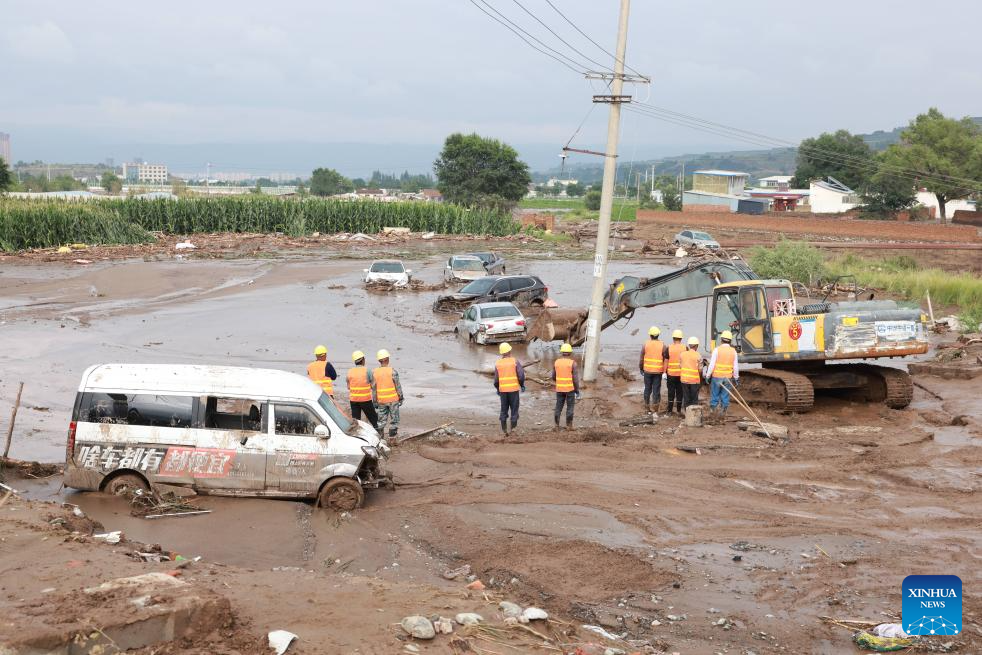 At about 2 p.m. Friday, Xinhua reporters saw floodwater mixed with uprooted trees blocking the roads near Xinglong Primary School in Chengguan Township in Yuzhong, with mud deposits more than 30 cm deep in some sections. Along the roadside, many vehicles lay damaged, while furniture from the ground floors of some houses had been swept to their doorsteps.