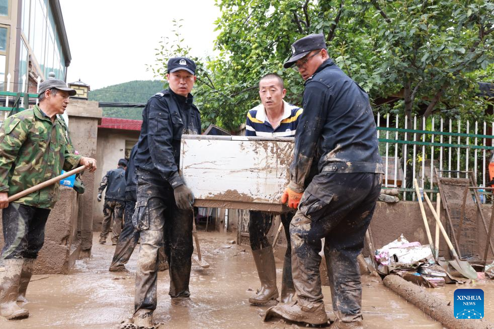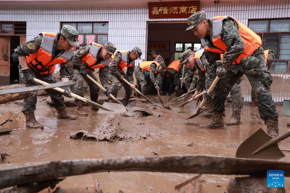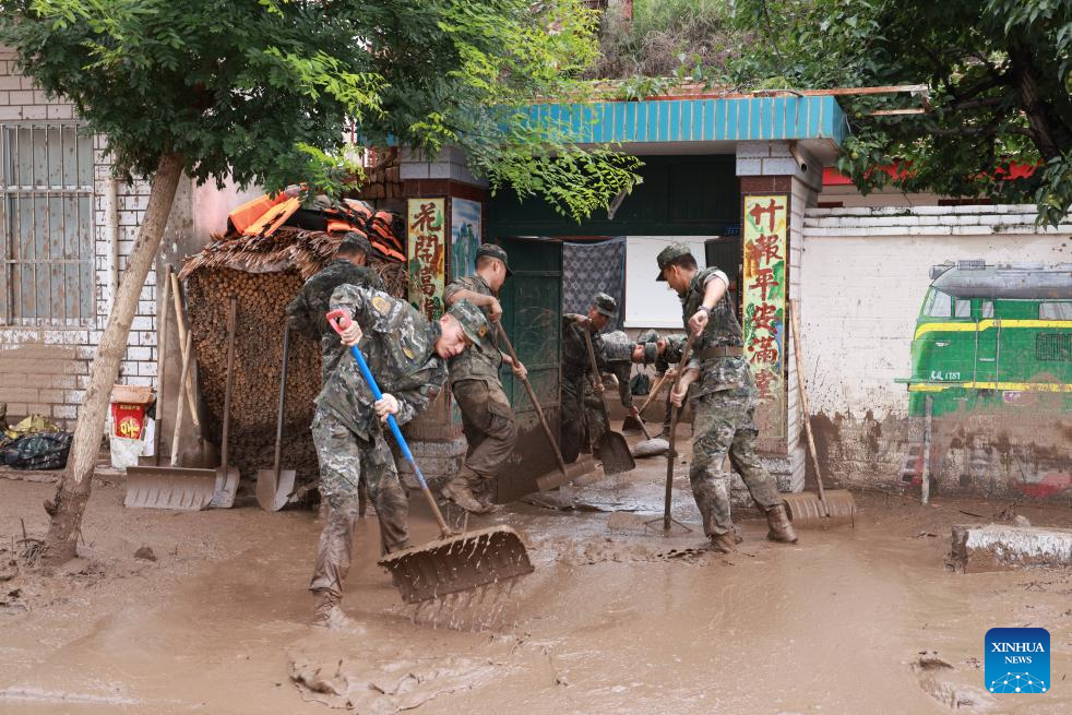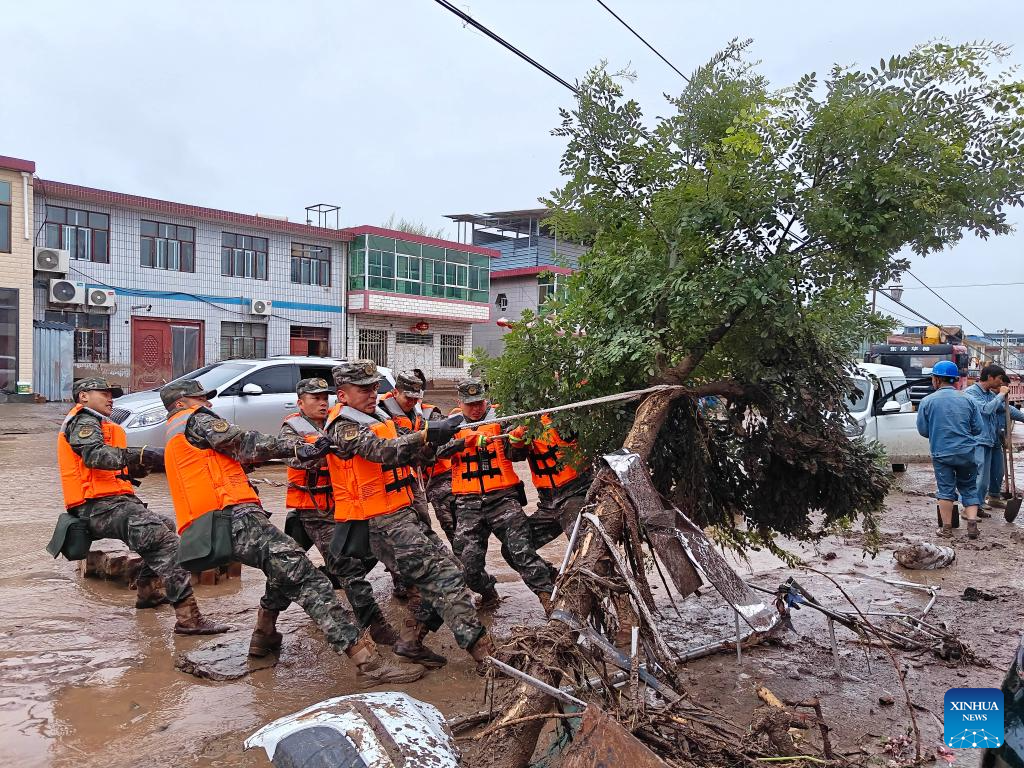 Members of the Chinese People's Armed Police Force remove a fallen tree after mountain torrents in Xinglongshan Village of Chengguan Town, Yuzhong County of northwest China's Gansu Province, Aug. 8, 2025. (Photo by Liu Yabin/Xinhua)