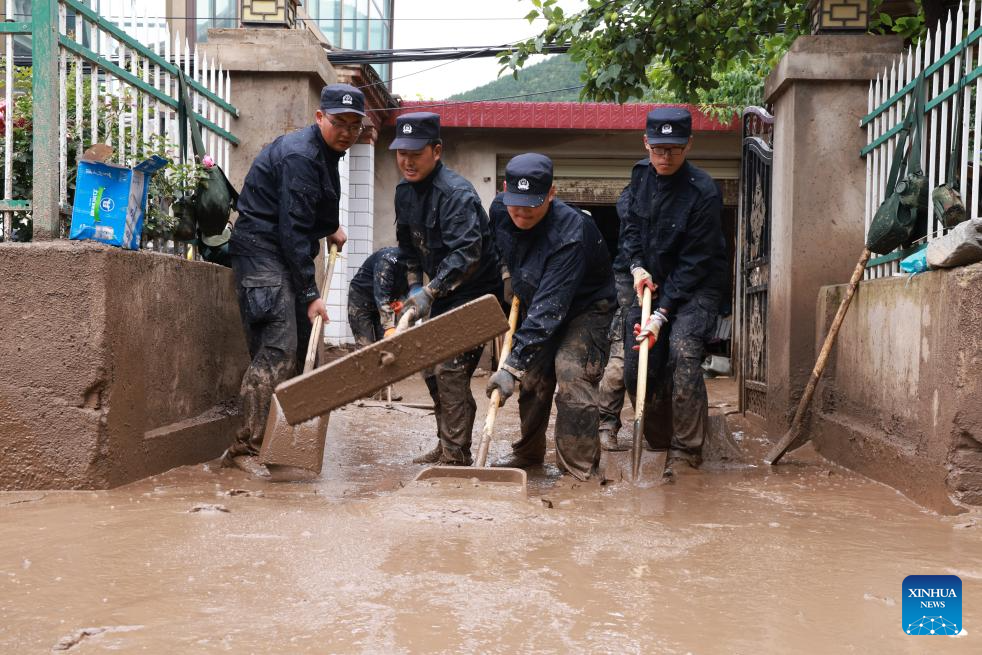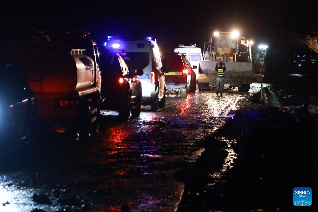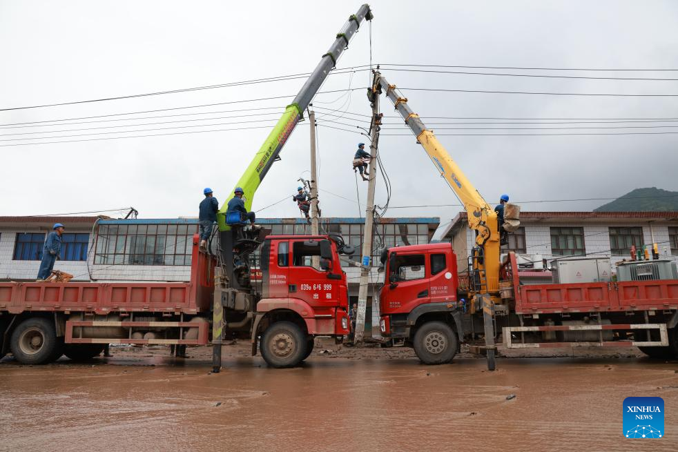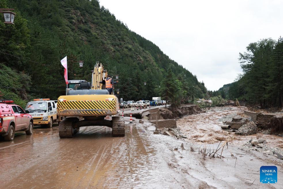 Emergency workers restore damaged roads at Maliantan Village in Yuzhong County of northwest China's Gansu Province on Aug. 8, 2025. Rescue efforts are underway after continuous heavy rainfall triggered mountain torrents in Yuzhong County.