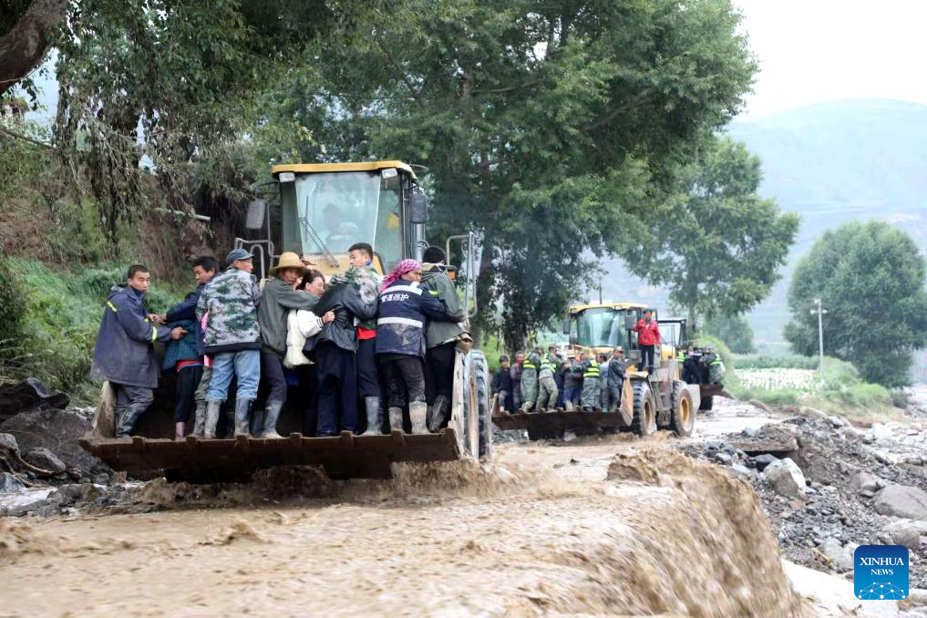 Affected residents are evacuated by a loader at Maliantan Village in Yuzhong County of northwest China's Gansu Province on Aug. 8, 2025. Rescue efforts are underway after continuous heavy rainfall triggered mountain torrents in Yuzhong County.