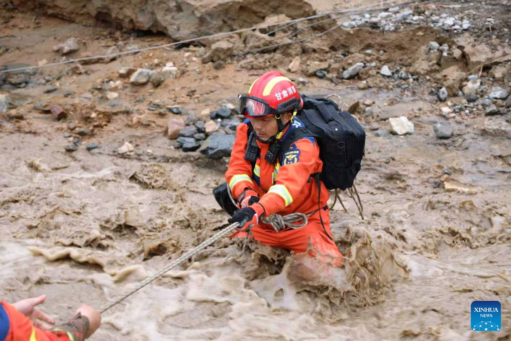 Rescuers work after mountain torrents at Xinglongshan Village in Yuzhong County of northwest China's Gansu Province, Aug. 8, 2025. (Photo by Jin Wangui/Xinhua)