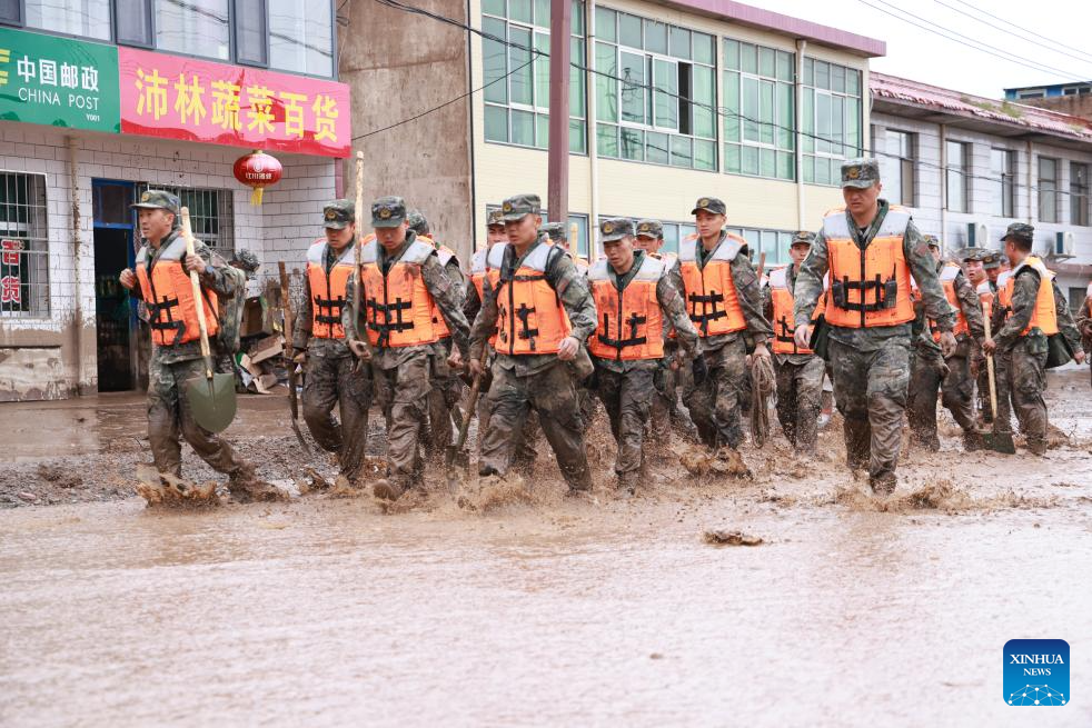 Members of the Chinese People's Armed Police Force march to mountain torrent-affected Jiuzhuanggou Village of Mapo Town, Yuzhong County of northwest China's Gansu Province, Aug. 8, 2025. (Photo by Liu Kun/Xinhua)