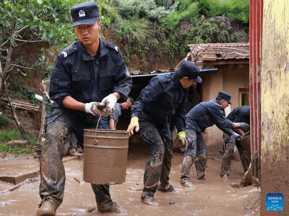 Members of the Chinese People's Armed Police Force remove a damaged car after mountain torrents in Xinglongshan Village of Chengguan Town, Yuzhong County of northwest China's Gansu Province, Aug. 8, 2025. (Photo by Liu Yabin/Xinhua)