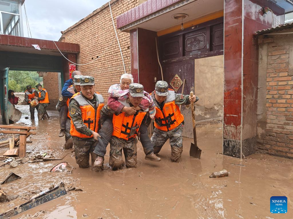 Members of the Chinese People's Armed Police Force evacuate residents after mountain torrents in Xinglongshan Village of Chengguan Town, Yuzhong County of northwest China's Gansu Province, Aug. 8, 2025. (Photo by Liu Yabin/Xinhua)