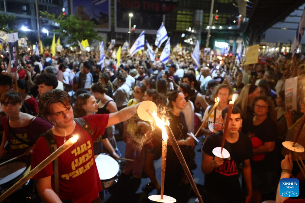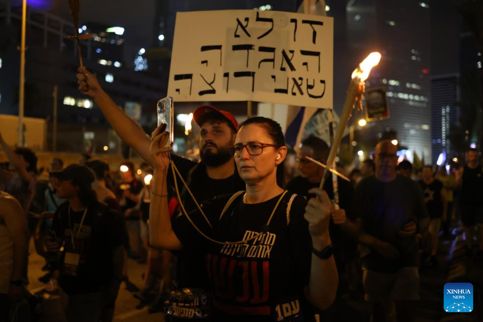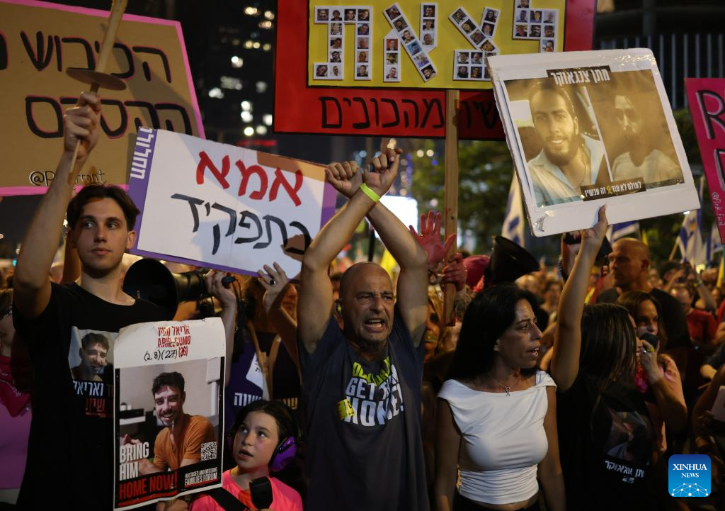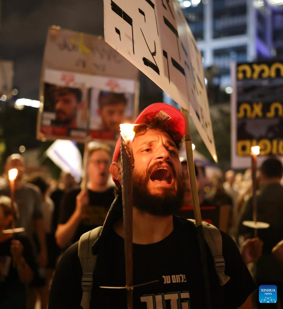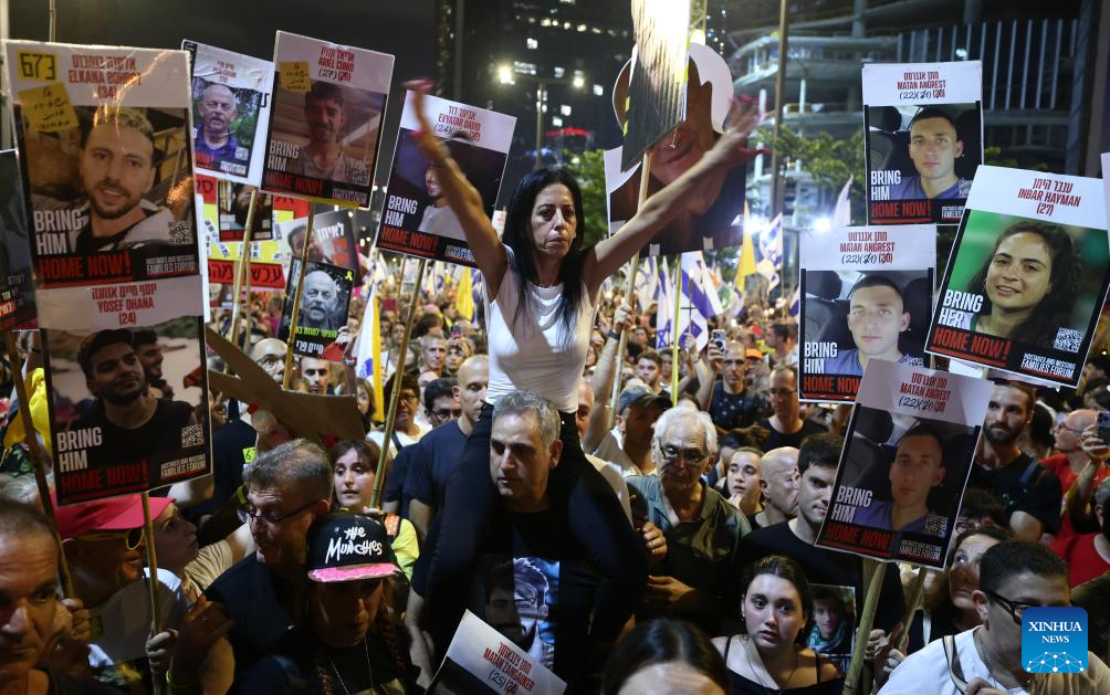 Meanwhile, thousands demonstrated in Tel Aviv's "Hostages Square" Saturday evening, calling for an end to the war through an agreement that would secure the release of Israeli hostages held in Gaza. (Photo by Jamal Awad/Xinhua)