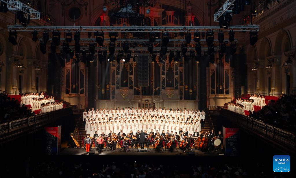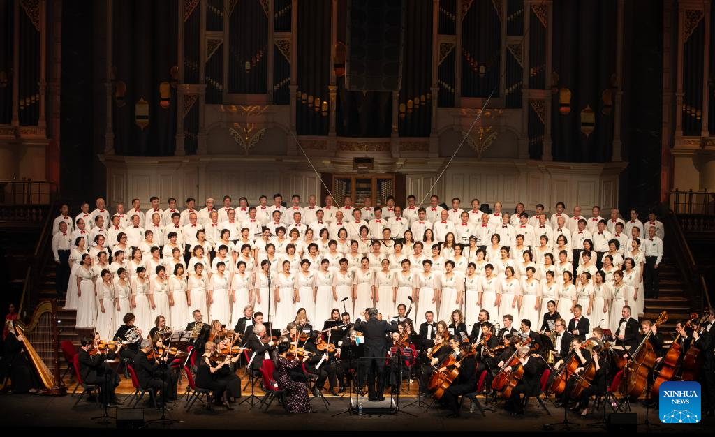 Performers perform during a grand symphonic epic concert, titled "Ode to Peace and the Future," at Sydney Town Hall in Sydney, Australia, Aug. 9, 2025. The concert, together with a photo exhibition were held here on Saturday to commemorate the 80th anniversary of the victory of the World Anti-Fascist War.(Xinhua/Ma Ping)