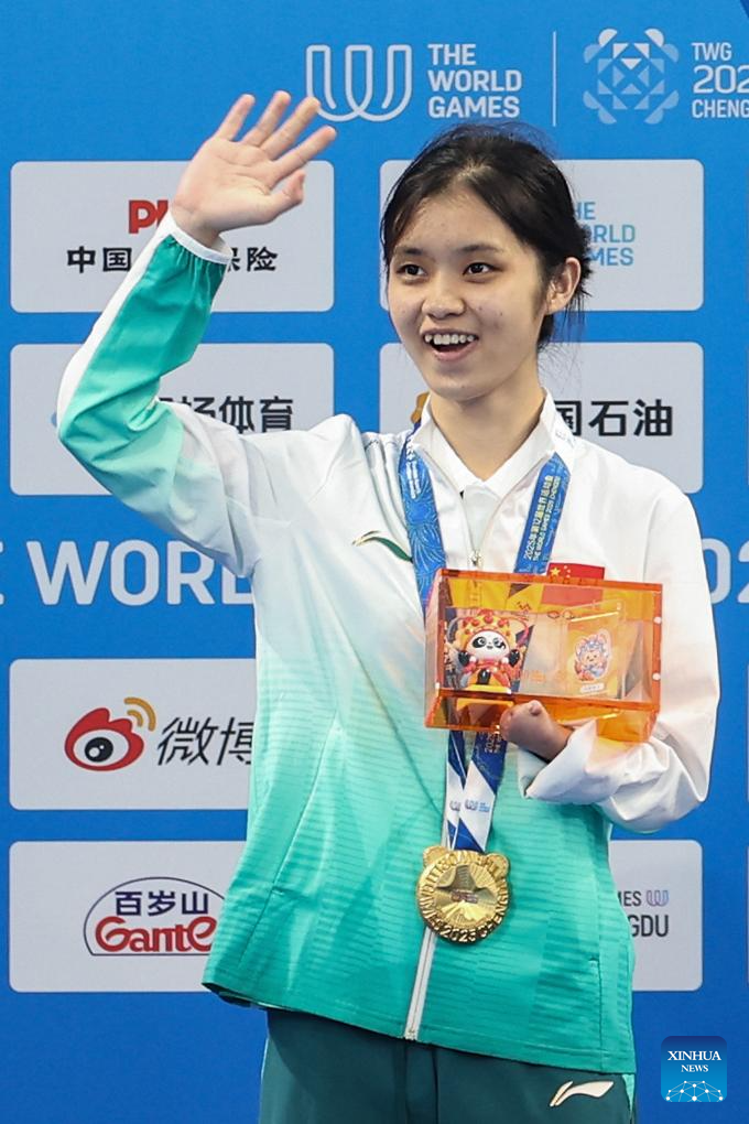 Gold medalist Huang Shiyu of China celebrates during the victory ceremony for the Women's Dynamic with Fins - FFS1-FFS2 Final of Freediving event at The World Games 2025 in Chengdu, southwest China's Sichuan Province, Aug. 10, 2025. (Xinhua/Zhang Liyun)
