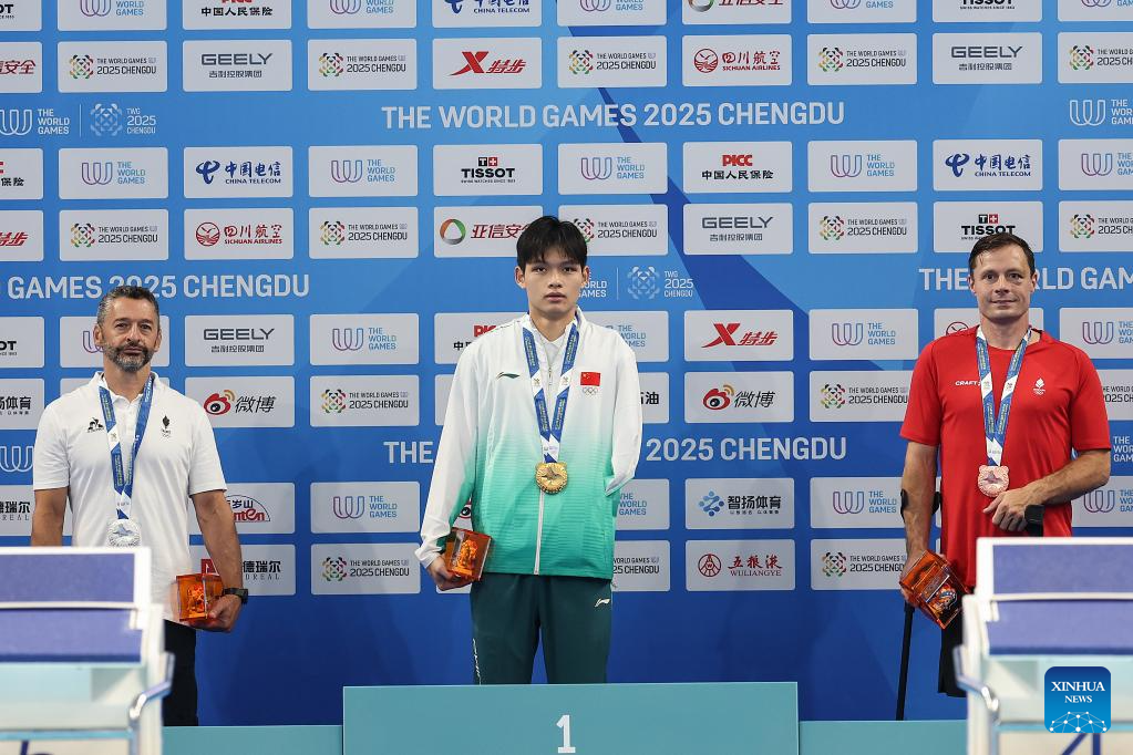 Gold medalist Long Dengxi (C) of China, silver medalist Alexandre Boscari (L) of France and bronze medalist Casper Marti-Beckmann of Denmark pose during the victory ceremony for the Men's Dynamic without Fins - FFS1-FFS2 Final of the Freediving event at The World Games 2025 in Chengdu, southwest China's Sichuan Province, Aug. 10, 2025. (Xinhua/Wang Xi)