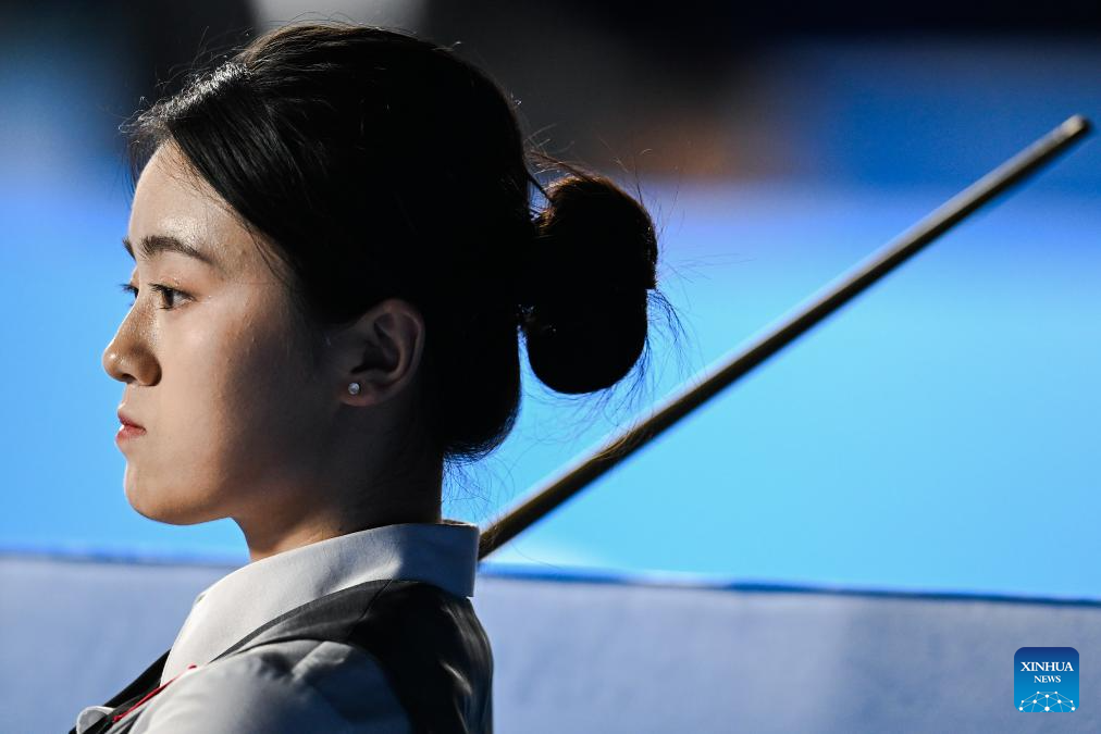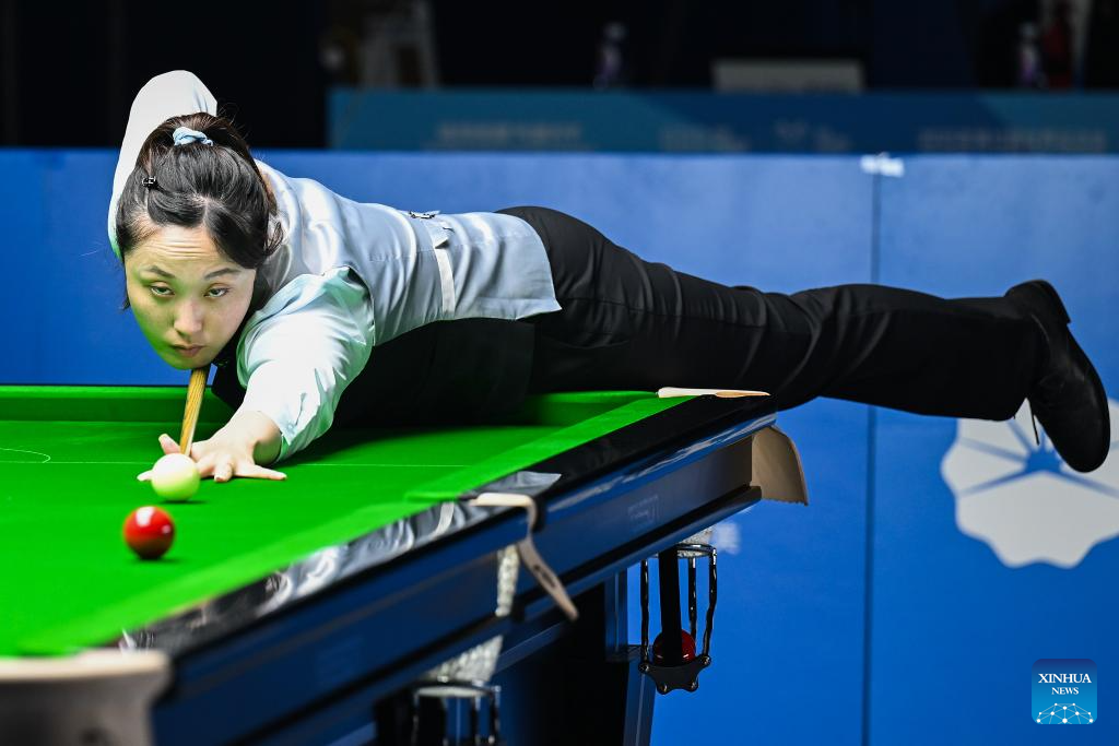 Fong Mei Mei competes during the women's six-red snooker preliminary round match between Bai Yulu of China and Fong Mei Mei of China's Hong Kong of Billiards event at The World Games 2025 in Chengdu, southwest China's Sichuan Province, Aug. 10, 2025. (Xinhua/Du Zixuan)