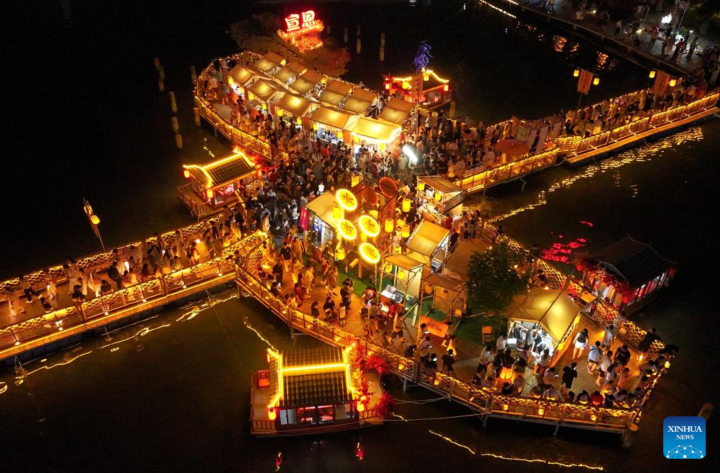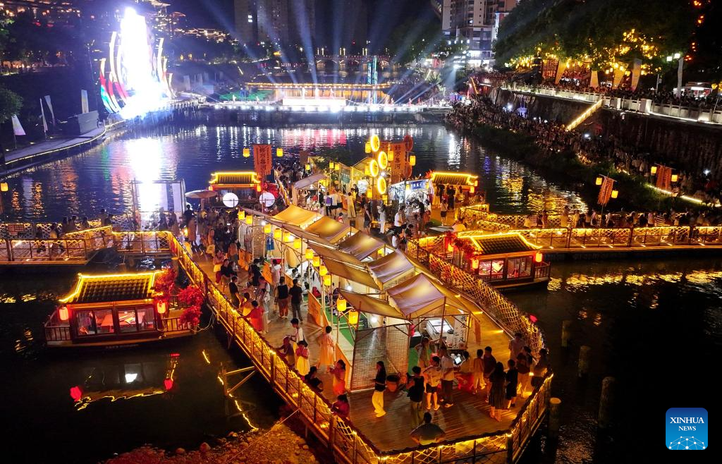 People visit a water market on the Gongshui River in Xuan'en County, Enshi Tujia and Miao Autonomous Prefecture, central China's Hubei Province, Aug. 9, 2025. The water market opened to the public here on Saturday evening. (Photo by Song Wen/Xinhua)