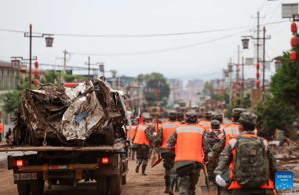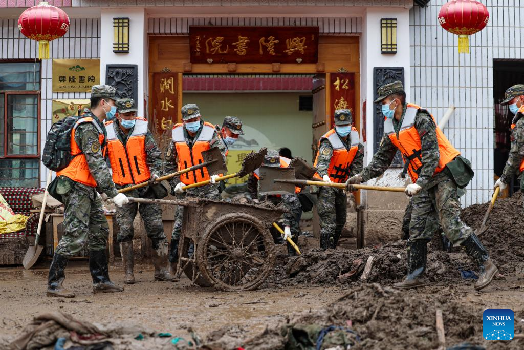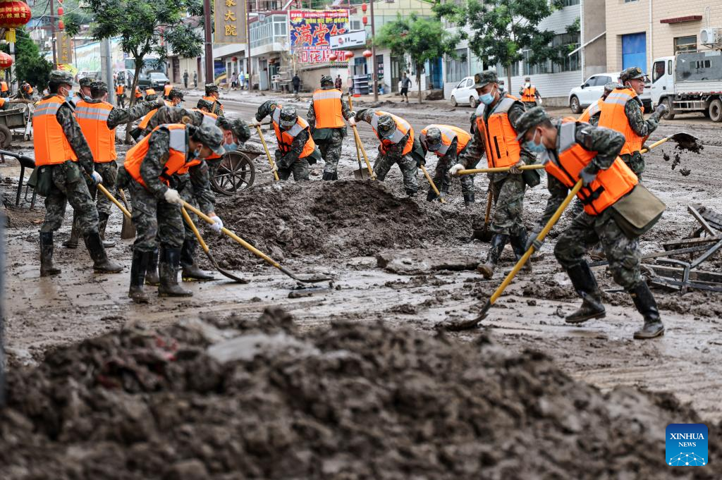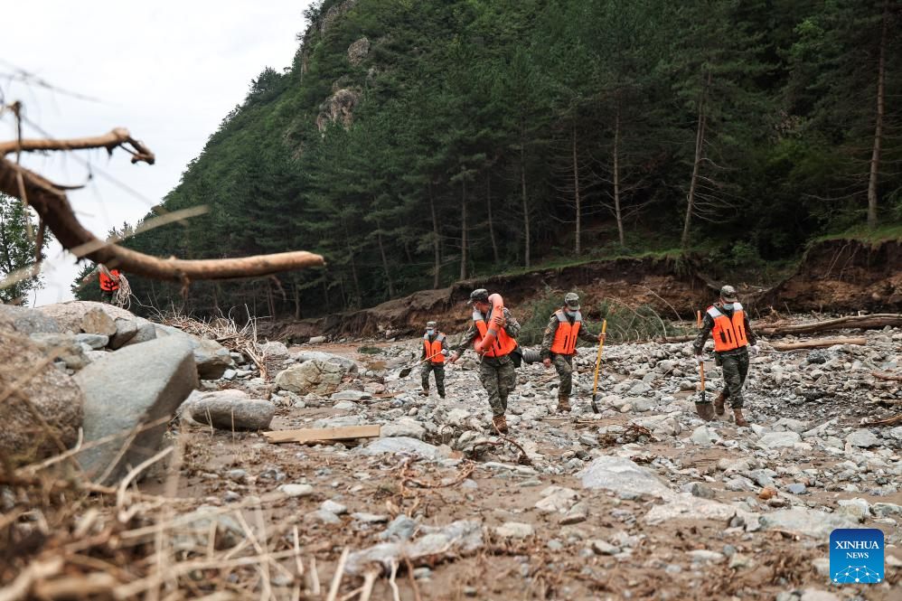 Members of the People's Armed Police Force Gansu Corps conduct rescue work in Xinglongshan Village, Yuzhong County of northwest China's Gansu Province, Aug. 10, 2025. The People's Armed Police Force (PAPF) Gansu Corps mobilized over 400 officers and soldiers on Sunday, deploying them to several villages in Yuzhong County, including Xinglongshan, Maliantan, Xiaokangying, and Jiuzhuanggou. The forces will conduct disaster relief work, which includes searching for missing individuals, roadway clearing, transferring materials, and disinfecting affected areas. (Photo by Hou Conghui/Xinhua)
