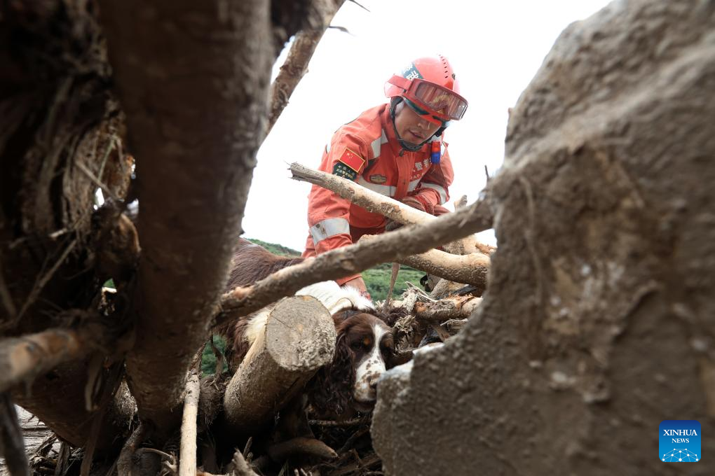 Members of the People's Armed Police Force Gansu Corps search for missing individuals in Maliantan Village, Yuzhong County of northwest China's Gansu Province, Aug. 10, 2025. The People's Armed Police Force (PAPF) Gansu Corps mobilized over 400 officers and soldiers on Sunday, deploying them to several villages in Yuzhong County, including Xinglongshan, Maliantan, Xiaokangying, and Jiuzhuanggou. The forces will conduct disaster relief work, which includes searching for missing individuals, roadway clearing, transferring materials, and disinfecting affected areas. (Photo by Liu Yabin/Xinhua)