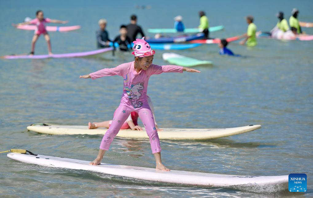 A girl surfs on a beach in Sanya City, south China's Hainan Province, Aug. 10, 2025. Tourists are flocking to Sanya for the pleasure of surfing during the summer vacation. (Xinhua/Guo Cheng)